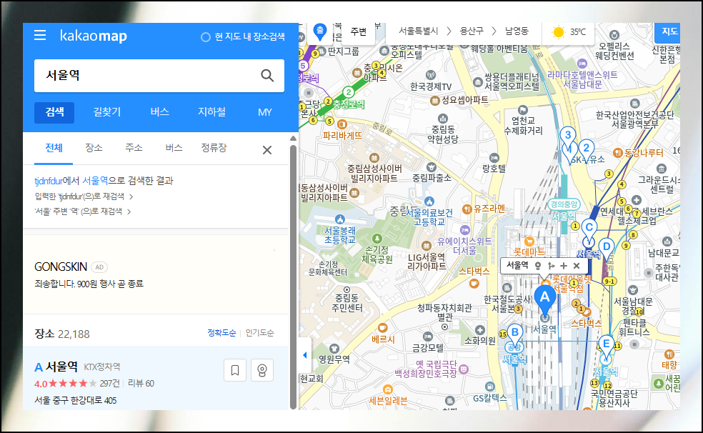 휘발유 최저가 업체를 찾는 방법은 생각보다 간단해요. 원하는 지역을 먼저 검색해 주세요. 서울역 근처 업체 정보를 예시로 들어보겠습니다. 화면 왼쪽 상단에 있는 검색창에 서울역을 타이핑하고 엔터를 누르면 됩니다.