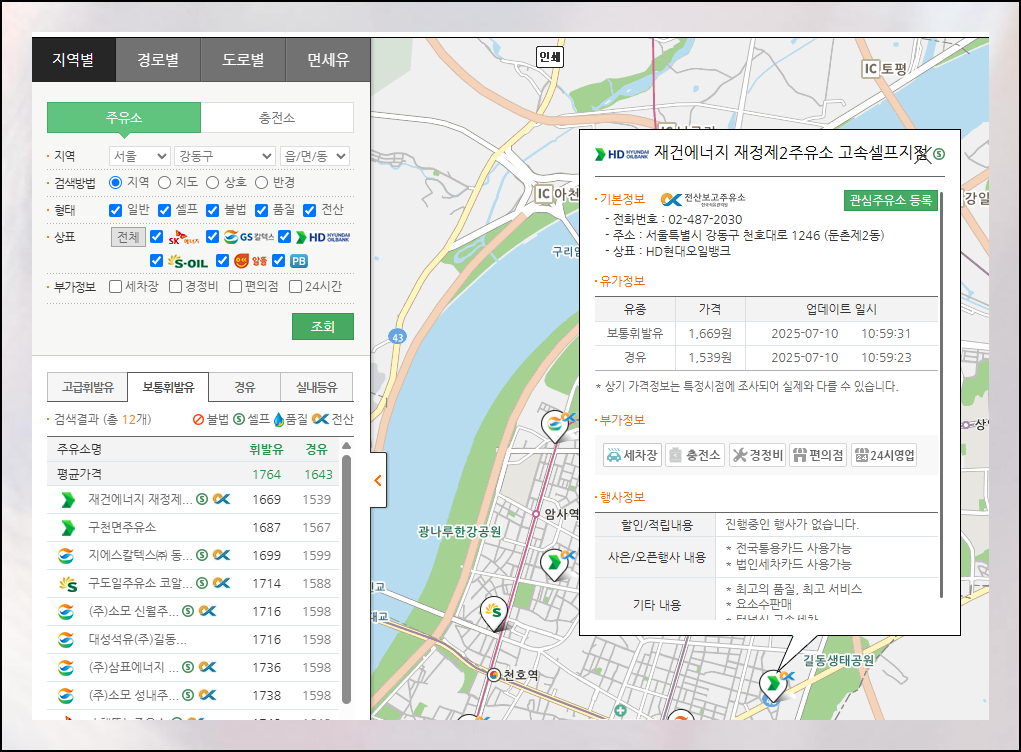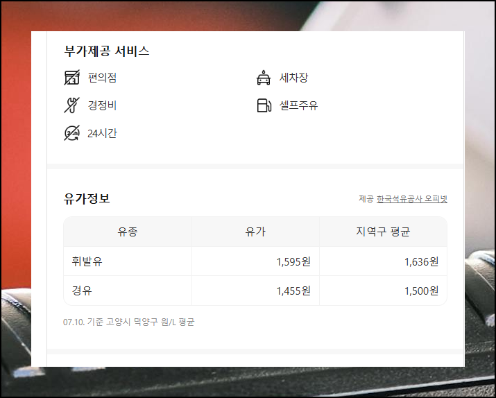 관심 있는 주유소를 클릭하면 상세한 정보를 볼 수 있어요. 유가 정보 섹션에서는 다양한 유종별 요금과 업데이트 시간을 확인할 수 있습니다. 업데이트 시간을 보면 실시간으로 가격비교를 할 수 있을 정도로 업데이트가 자주 이루어져요.