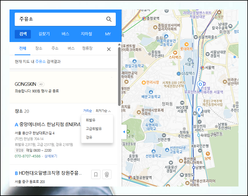 화면 오른쪽에 서울역이 중심에 있는 지도가 표시되요. 검색창 바로 위에 있는 현 지도 내 장소검색에 체크표시를 해주세요. 그 다음 "주유소"라고 검색하면 서울역 주변 모든 주유소가 나타납니다. 각 업체마다 휘발유, 고급휘발유, 경유 비용을 한눈에 볼 수 있어요.