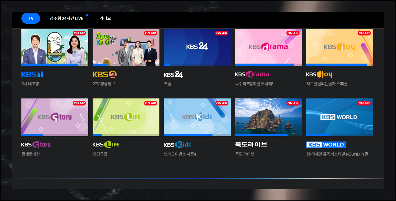 예전에는 kbs1과 kbs2 두 개 채널만 있는 줄 알고 있었는데요. 사이트에 방문해 보면 아시겠지만, 다양한 채널을 이용할 수 있게 되어 있습니다. KBS World, KBS24, KBSN 드라마, KBSN 조이, KBSN W, KBSW Life 같은 특화된 채널들이 각각의 고유한 콘텐츠를 제공하고 있습니다.