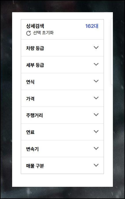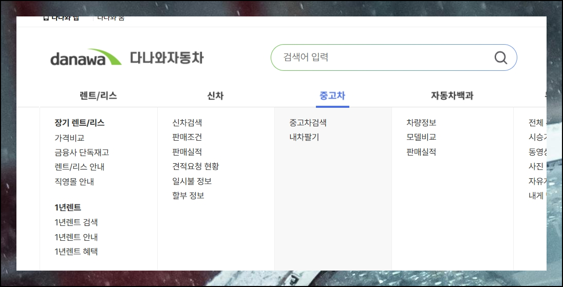 사이트 메인 화면에서 중고차 검색 메뉴를 클릭해보세요. 이곳에서는 신차 정보는 물론 렌터카나 리스 차량의 시세표도 함께 조회할 수 있어요.