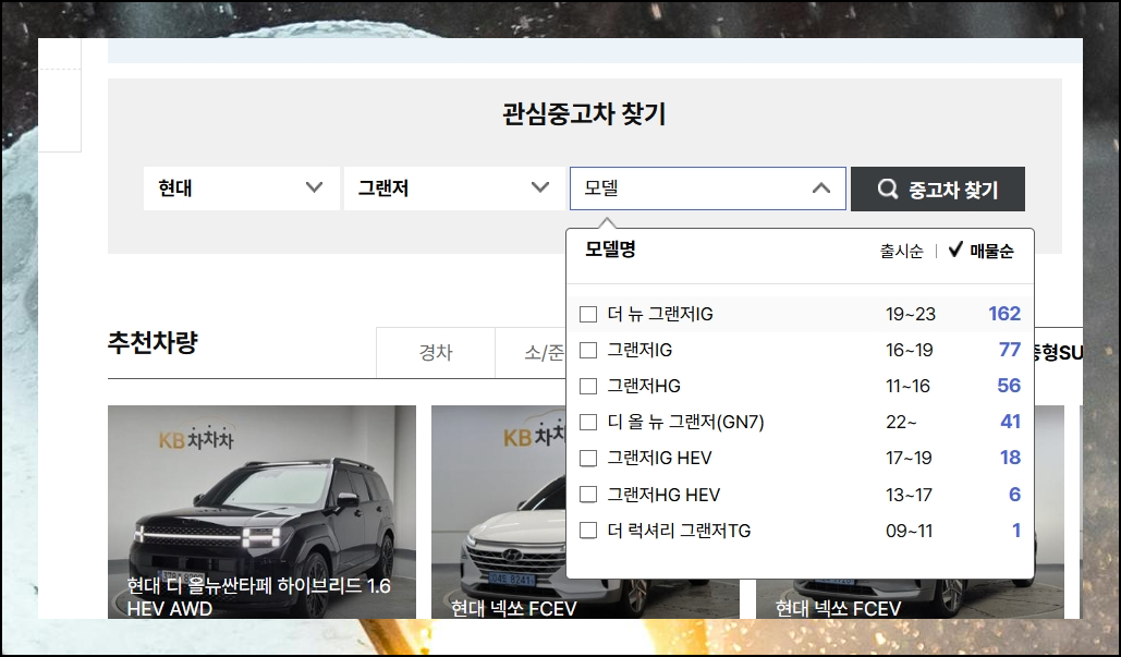 새로운 페이지가 열리면 관심 매물 찾기 서비스가 나타나요. 먼저 현대 브랜드를 선택하고, 이어서 시리즈와 모델 부분에서 원하는 차종을 지정하면 돼요. 매물 수가 많을수록 정확한 시세표 파악이 가능합니다.