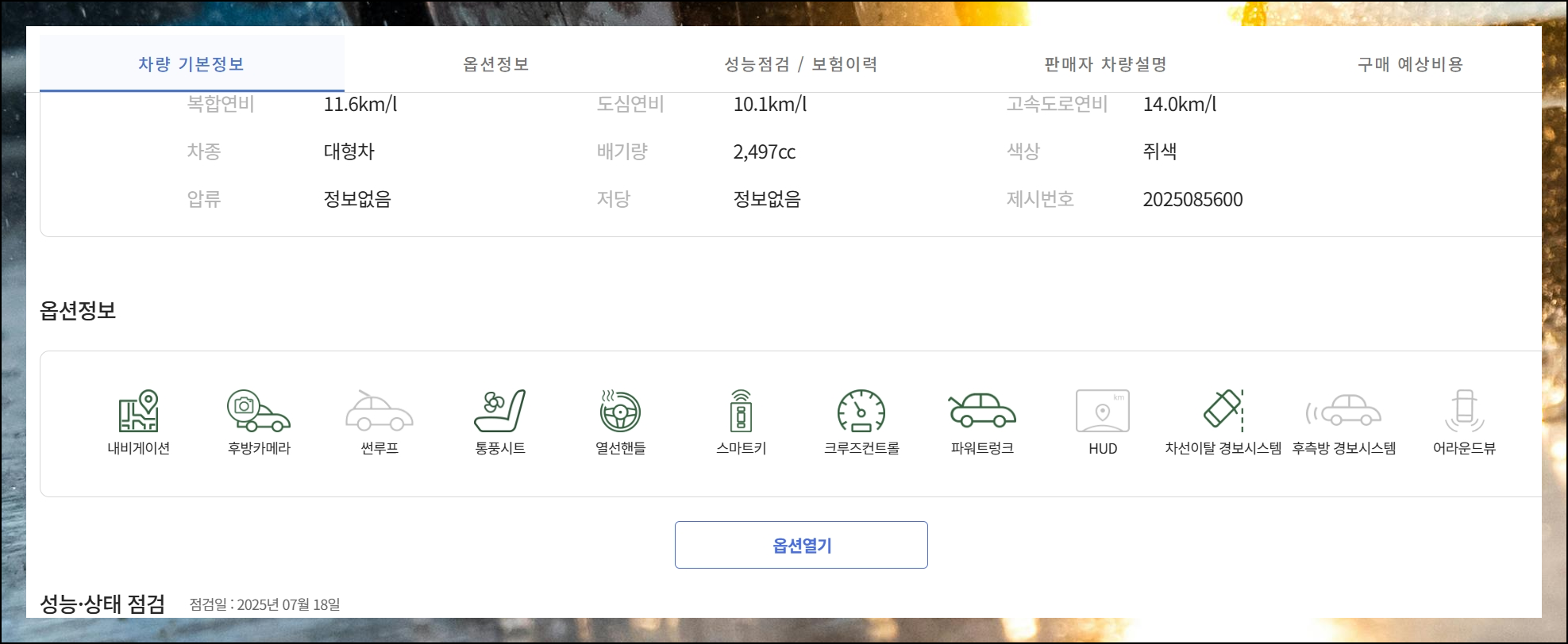 사진 체크가 끝나면 차량의 기본 사양, 장착 옵션, 성능 지표, 사고 이력 등을 꼼꼼히 점검하는 것이 중요해요. 이미 옵션이 정해져 있기 때문에 평소 원했던 기능들이 포함되어 있는지 세심하게 살펴보시기 바랍니다.