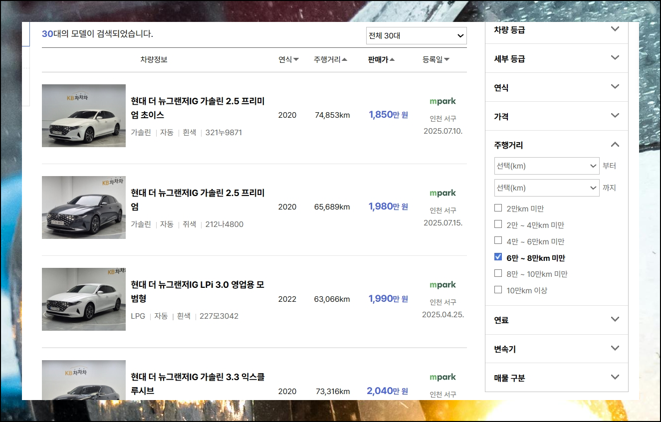 개인적으로는 주행거리를 기준으로 시세표를 살펴보는 편이에요. 설정한 조건에 맞는 차량이 30대나 검색되었네요. 각 매물의 소재지와 등록 일자도 한눈에 파악할 수 있어요.