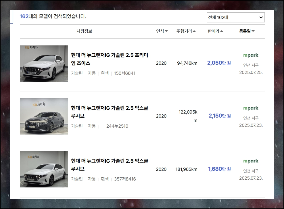 매물이 풍부한 "더 뉴 그랜저IG" 모델을 선택해보았어요. 깔끔하게 정리된 시세표가 화면에 표시됩니다. 가격은 물론이고, 다양한 차량 정보를 한 번에 체크할 수 있어요. 화면 우측의 상세 검색 기능을 활용하면 특정 조건에 맞는 매물만 골라서 비교해볼 수 있습니다.