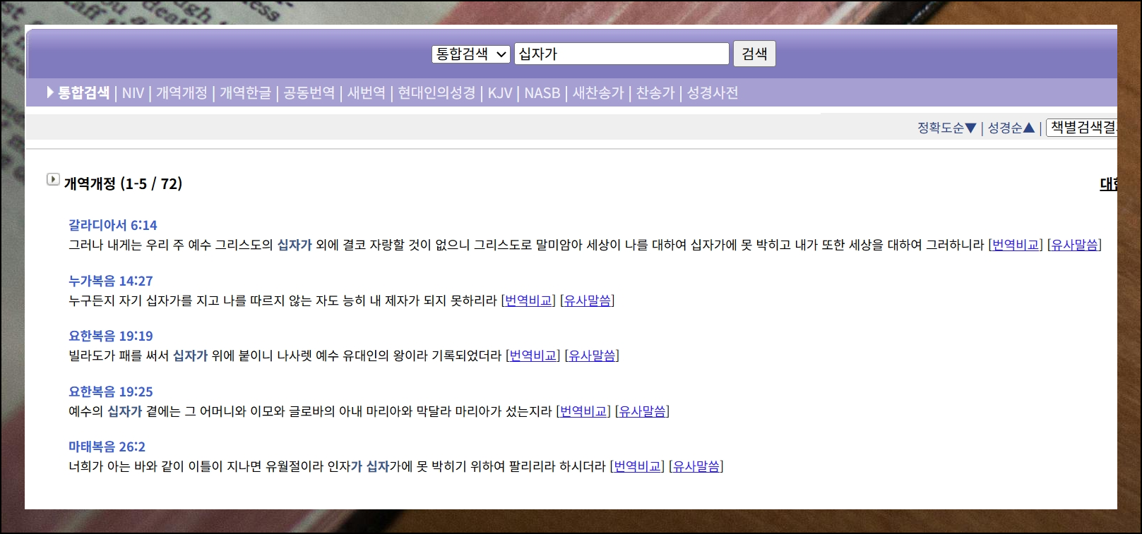 "십자가"라는 용어가 들어간 말씀들을 찾아보았습니다. 총 72개의 성경 구절이 검색되었어요. 검색 화면을 보면 번역 비교 외에도 유사말씀이라는 버튼이 추가로 보입니다.