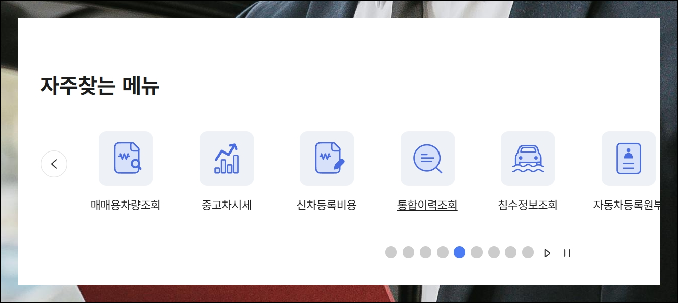사이트에 들어가면 "자주찾는 메뉴"를 만나볼 수 있어요. 여러 가지 조회나 시세 정보 확인 등 다양한 서비스를 다루고 있습니다. 여기서 중간 쯤에 위치한 "통합이력조회"를 찾으시면 됩니다. 사이트 메뉴의 배치가 사용자 친화적으로 설계되어 있어서 컴퓨터에 익숙하지 않은 분들도 쉽게 원하는 기능을 찾을 수 있어요.