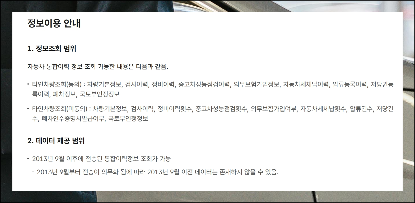 인증 절차가 끝나면 바로 원하는 차량의 상세 정보를 차량조회할 수 있어서 정말 편리해요. 이후부터는 사이트 화면에 나오는 정보들을 차근차근 확인하시면 되니까 사용법 설명은 여기서 마무리하겠습니다.