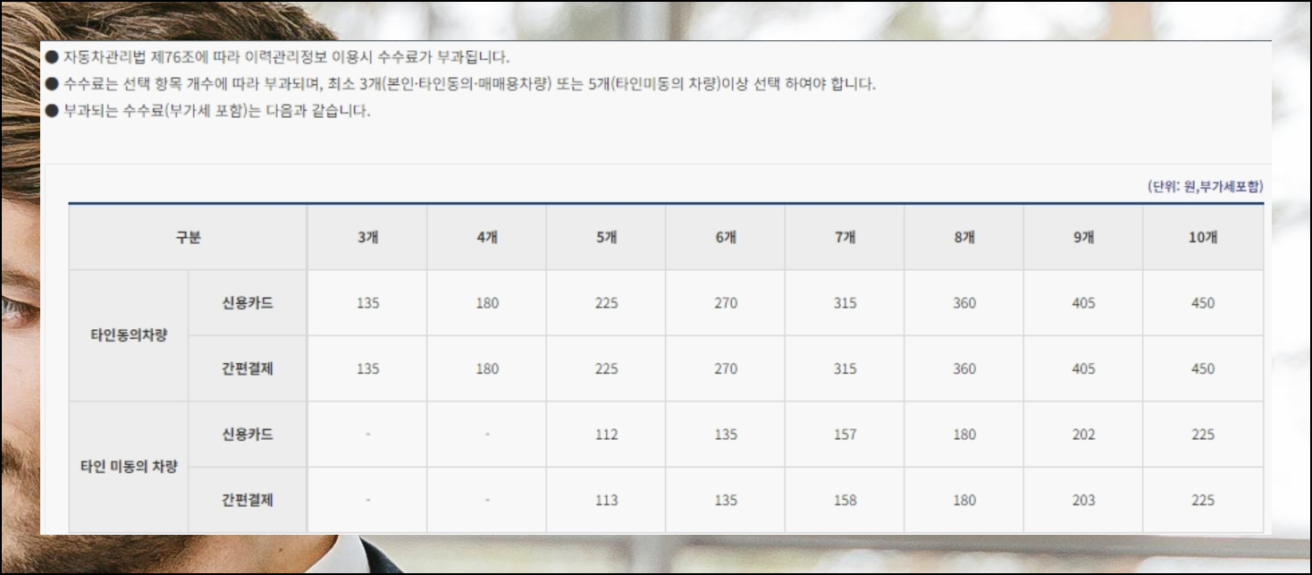 사이트에서 차량조회 서비스를 이용할 때 결제를 해야 하는데요. 신용카드나 간편결제 중에서 편한 방법을 선택하시면 됩니다. 다른 사람 차를 차량조회할 때 그 차주가 정보 공개를 허락했느냐에 따라 요금에 차이가 생겨요. 전반적으로 보면 부담스럽지 않은 가격대를 유지하고 있어서 부담 없이 이용하실 수 있어요. 검색하고 싶은 항목 개수에 따라 비용이 결정되는 방식이고, 최소 3개에서 최대 5개까지의 항목을 선택해야 합니다.