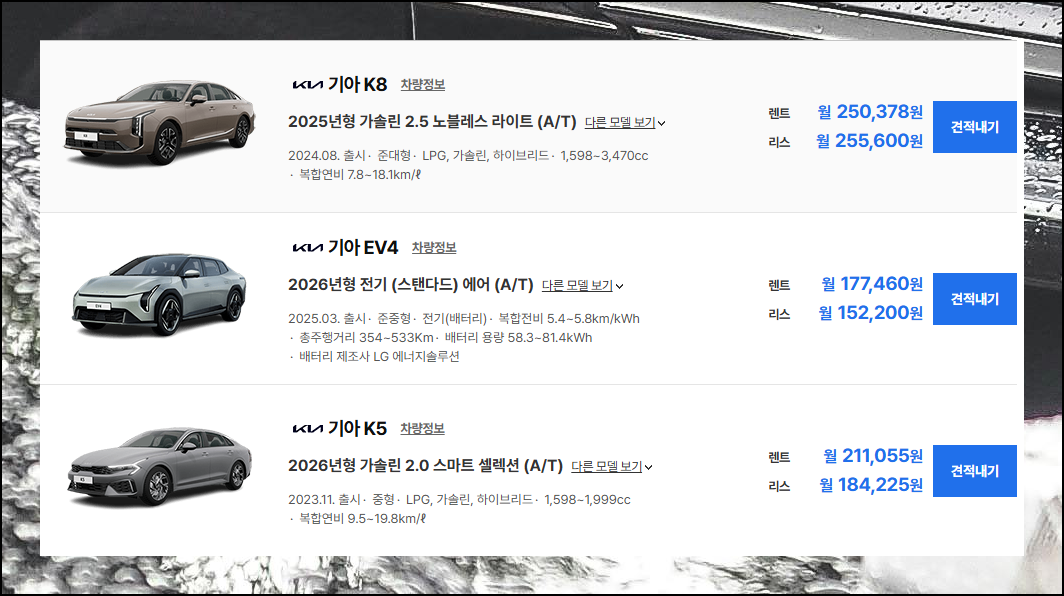 여러 렌트 업체의 조건을 동시에 비교해볼 수 있는 기능이 제공되어요. 동일한 차량이라도 업체별로 제공하는 옵션과 혜택이 다를 수 있으니까 세심하게 검토하고 결정하세요. 장기렌트 계약 전에는 이렇게 가격비교를 진행하는 것이 현명합니다.
