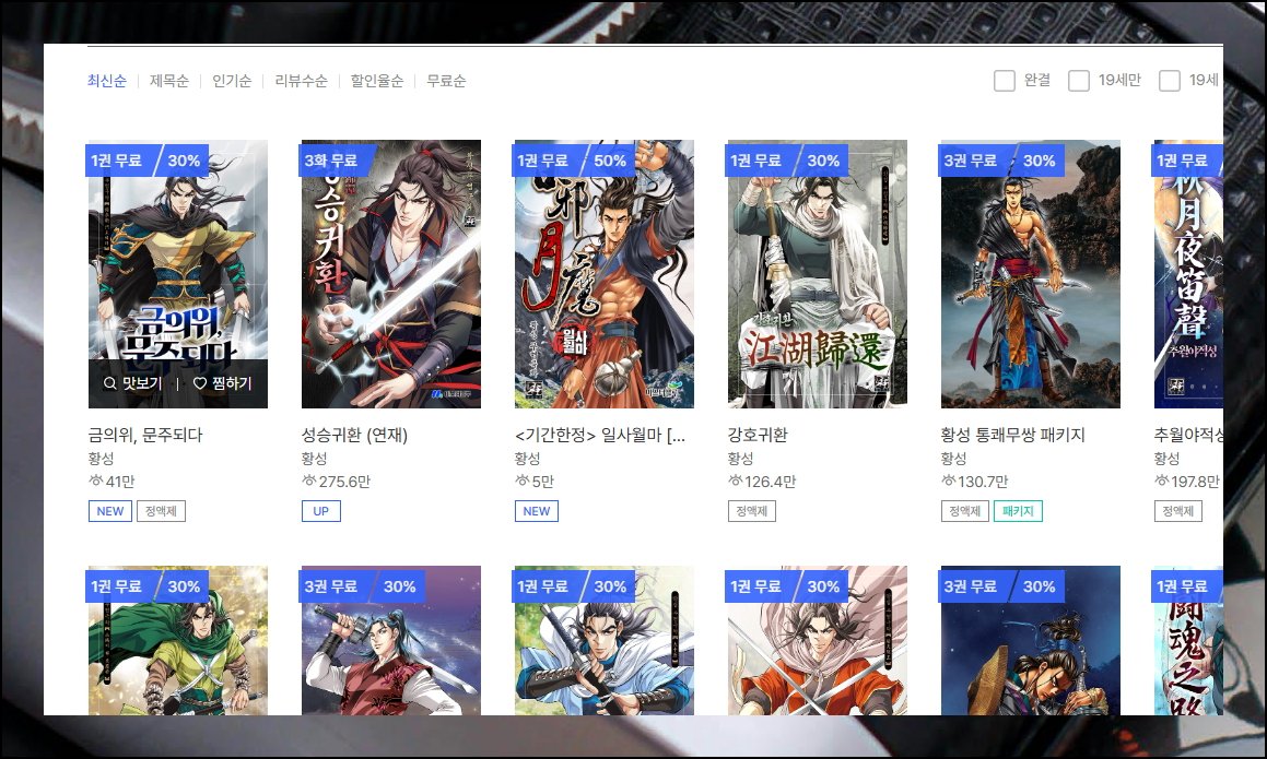 페이지 내에서 인기순으로 정렬하면 황성 무료만화들이 상위권에 배치됩니다. 금의위를 비롯해 성승귀환, 강호귀환, 일사월마 등 흥미로운 작품들을 만날 수 있어요. 황성 작가의 독특한 스토리텔링을 경험해볼 수 있는 기회입니다. 각 웹툰마다 무상으로 제공이 되는 권수는 다르지만, 선택의 폭이 매우 넓어요. 여기 있는 작품에서만 맛볼 수 있는 매력적인 캐릭터와 전개를 확인해보세요.