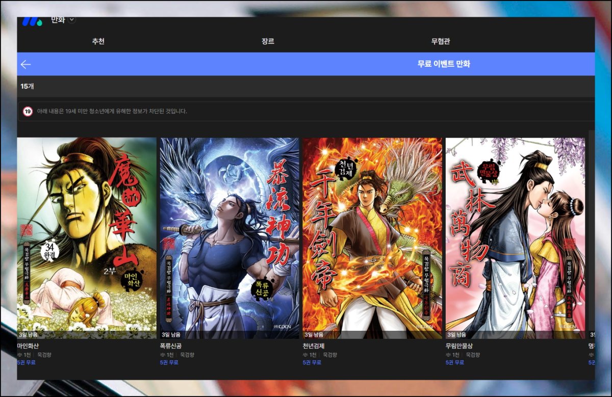 무료 만화 페이지에서는 웹툰부터 소설까지 여러 카테고리를 확인할 수 있어요. 이 중에서 만화 항목을 선택해주시면 됩니다. 각 카테고리별로 명확하게 구분되어 있어서 찾기 쉬운데요. 무협을 선택해 보세요. 그럼 우리가 찾는 황성 작가님의 이름이 보입니다.