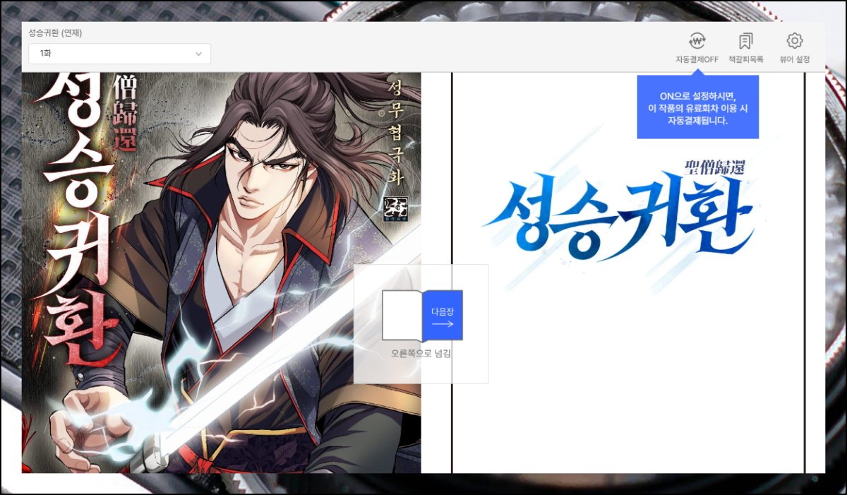 황성의 대표 무협만화 성승귀환을 예시로 살펴보겠습니다. 보기 버튼을 클릭하면 즉시 감상을 시작할 수 있어요. 고화질 이미지와 사용자 친화적인 인터페이스가 제공됩니다. 페이지 넘김이나 확대 기능 등이 직관적으로 구성되어 있는데요. 편안한 독서 환경에서 몰입감 있는 감상이 가능해요.