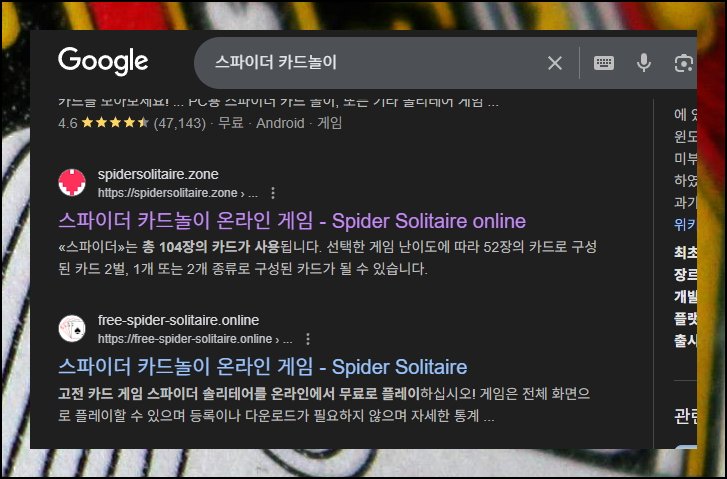 구글 검색창에 스파이더 카드놀이만 입력하면 됩니다. 한글 지원 사이트가 바로 검색결과에 나타나요. 링크나 이미지를 클릭하면 메인화면으로 이동할 수 있습니다.