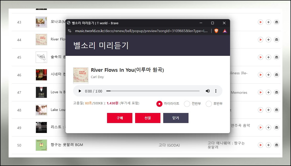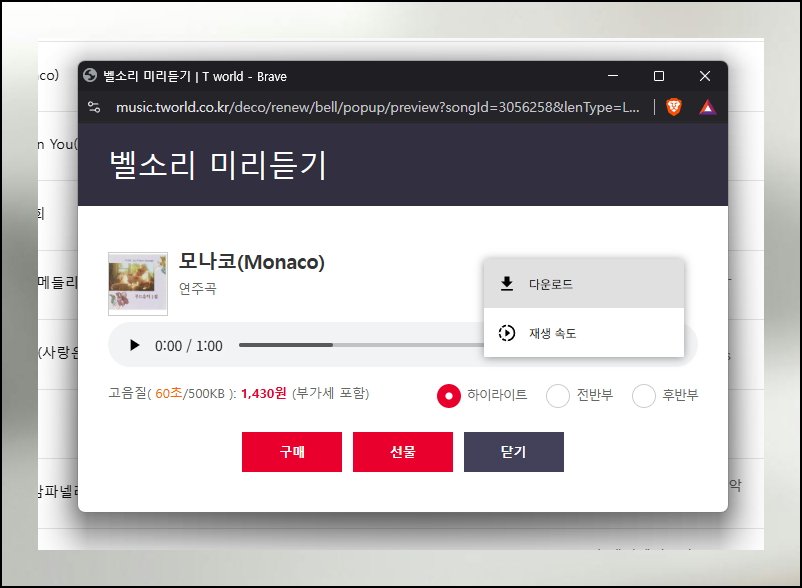 음원 목록을 살펴보면 앨범 커버 옆에 작은 재생 아이콘이 있어요. 이걸 클릭하면 미리듣기 팝업이 뜹니다. 하이라이트 구간, 앞부분, 뒷부분 이렇게 세 가지 방식으로 감상할 수 있는데요. 마음에 드시면 구매 버튼을 눌러보세요. 약간의 비용이 들긴 하지만요. 내 스마트폰에 저장해서 쓸 수 있어요.