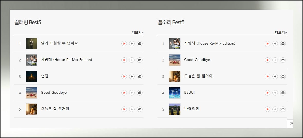 새로 나타난 화면을 보시면 1위부터 5위까지의 컬러링과 벨소리가 정리되어 있어요. 휴대폰 알림음 추천 목록이 한눈에 들어옵니다. 더보기 버튼을 클릭하시면 더 많은 순위를 볼 수 있죠.