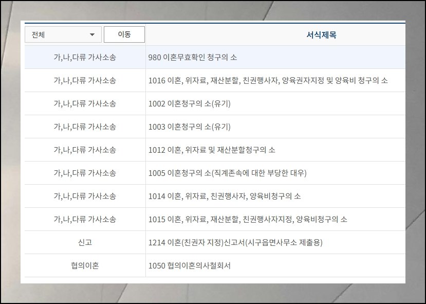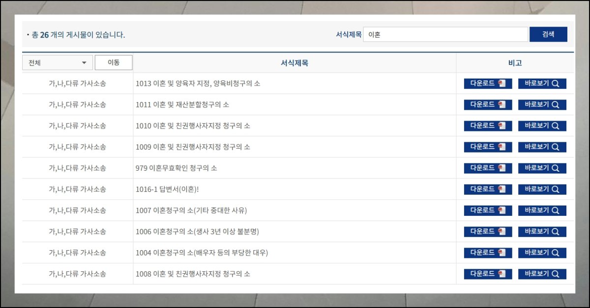 해당 사이트에서는 유사 사례를 조회하거나 전문가 조언을 구할 수 있어요. 이혼 외에도 광범위한 종류의 공식 문서 틀이 갖춰져 있습니다. 메인 화면에서 관련 정보 탭을 누른 뒤 서식 항목으로 이동하면 원하는 양식에 도달합니다.