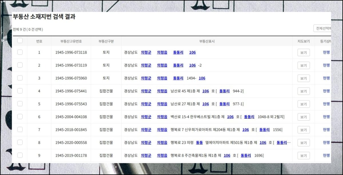 이어지는 화면에서는 등기부등본의 무료열람 가능 항목을 살펴볼 수 있어요. 해당 부동산의 고유 식별 번호, 지번 주소, 소유자 성씨 세 가지 핵심 데이터를 비용 부담 없이 파악할 수 있습니다.