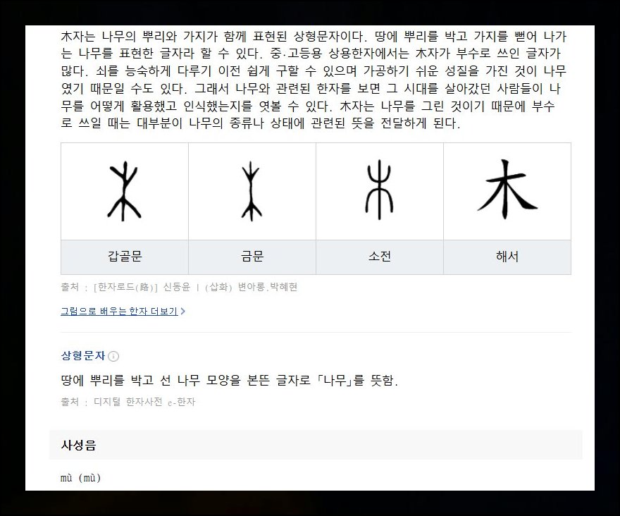 구체적인 의미 풀이에 더해 그림 문자의 탄생 배경까지 탐구 가능해요. 일례로 목 자는 땅에 뿌리 박은 수목의 형상에서 출발했다고 한문사전에서 설명하고 있습니다. 인쇄물로는 접하기 힘들었던 유사 형태 글자 간 대조 자료도 같이 제공돼요. 앱 다운 없이 무료로 이 모든 정보를 살펴볼 수 있다는 게 큰 장점이에요.