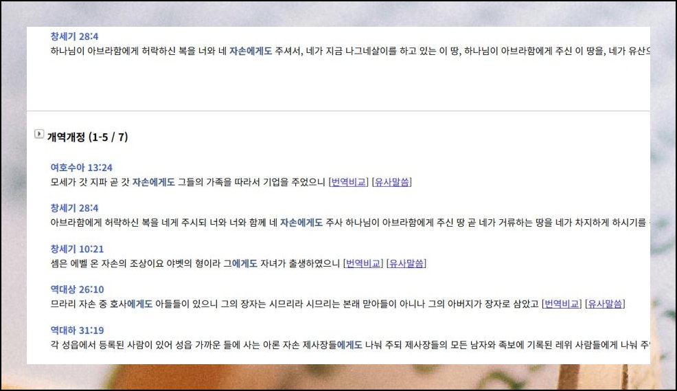해석이 까다로운 성경 대목을 만나면 앞뒤 문장까지 펼쳐보세요. 찾기 결과에서 인접한 내용을 함께 훑으면 전체 줄거리가 손에 잡힙니다. 이런 식으로 문맥을 넓혀가면 본래 전하려는 뜻이 훨씬 선명해져요.