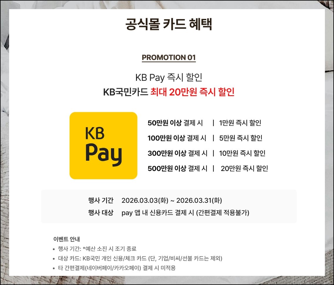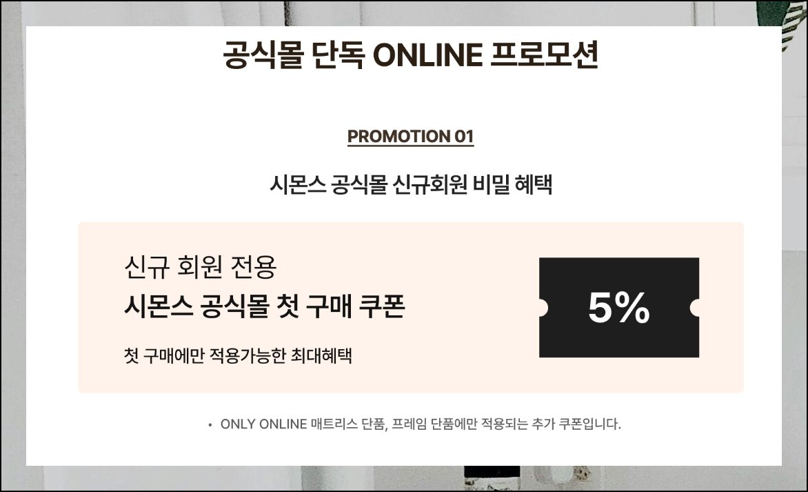 시몬스 공식 사이트에서는 비정기적으로 가격 할인 이벤트가 진행됩니다. 특정 시즌이 돌아오면 매트리스와 프레임, 룸세트, 베딩세트를 패키지로 묶어 파격적인 가격에 선보이기도 해요. 고급 등급 제품을 원래 가격보다 부담 없이 구입할 수 있는 드문 기회입니다. 공식 채널 구매에는 정품 인증과 사후 관리 서비스가 함께 따라오니 참고하세요.