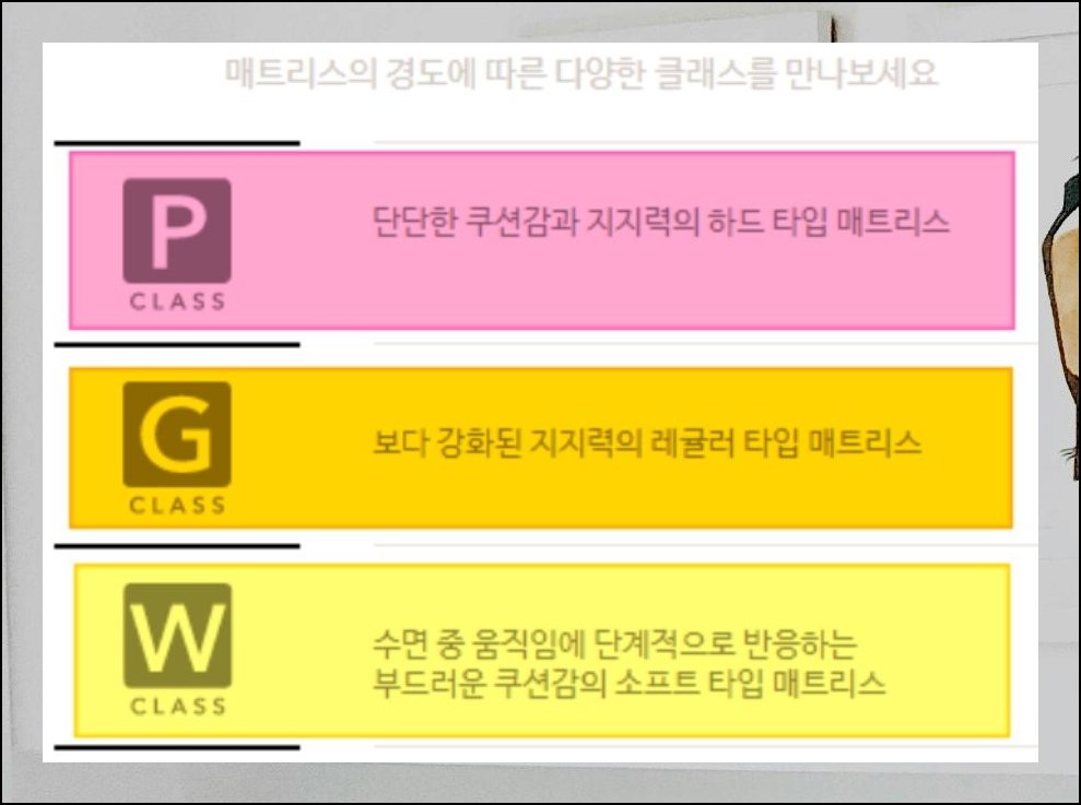 매트리스 경도 등급을 시몬스에서는 P, G, W 세 종류로 구분하고 있어요. P 등급은 단단한 하드 타입으로 척추를 탄탄하게 잡아주는 힘이 돋보입니다. W 등급은 푹신한 소프트 타입이라 몸이 자연스럽게 안기는 감각이 매력이에요. G는 양쪽 중간 지점의 보통 타입으로 균형 잡힌 반발력을 제공합니다. 골격 조건이나 잠버릇에 따라 체감이 달라지므로 매장에서 체험 후 정하시길 바랍니다.