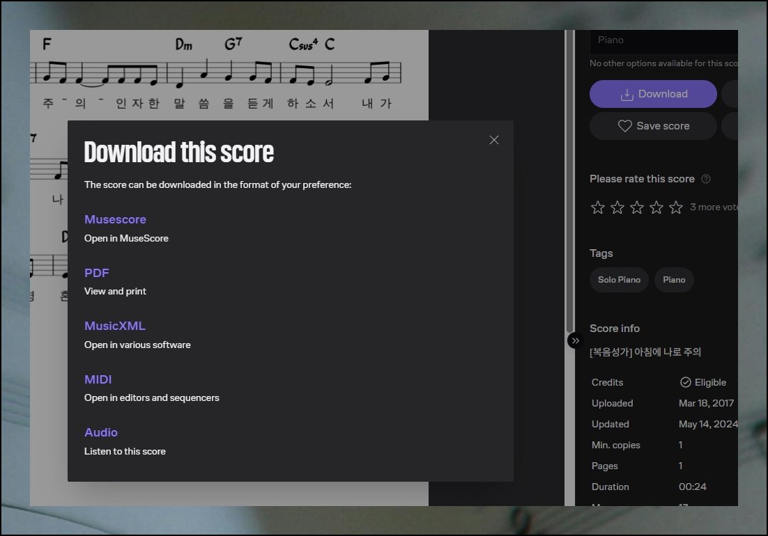 오른편에 자리한 Download 버튼을 누르면 별도 창이 뜹니다. 모두 다섯 종류의 포맷 중에서 고를 수 있어요. 인쇄용 악보가 필요하면 PDF를 택하고, 소리 파일을 원하면 MIDI 또는 Audio 옵션을 잡으면 됩니다.